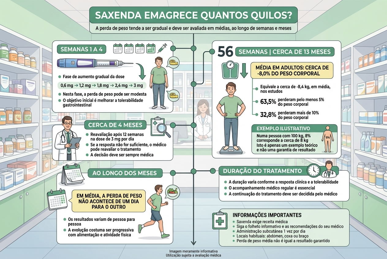 A expressão "Saxenda antes e depois" é uma das mais pesquisadas, mas é importante gerir expectativas com realismo. Estudos mostram resultados populacionais médios; na prática, existe variabilidade: