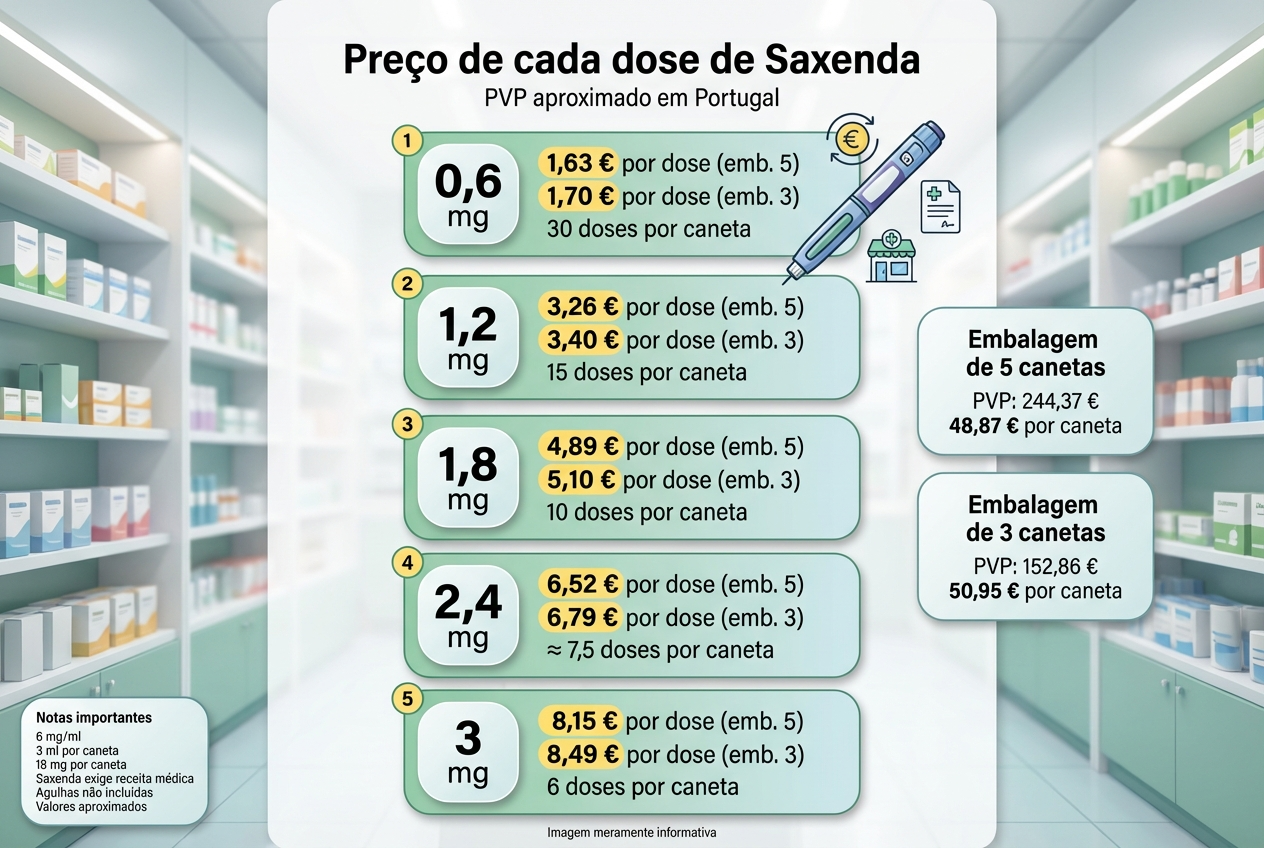 O valor varia consoante a apresentação adquirida (3 ou 5 canetas por embalagem), a fase do escalonamento de dose e eventuais descontos comerciais. Confirme sempre o preço atualizado na sua farmácia.