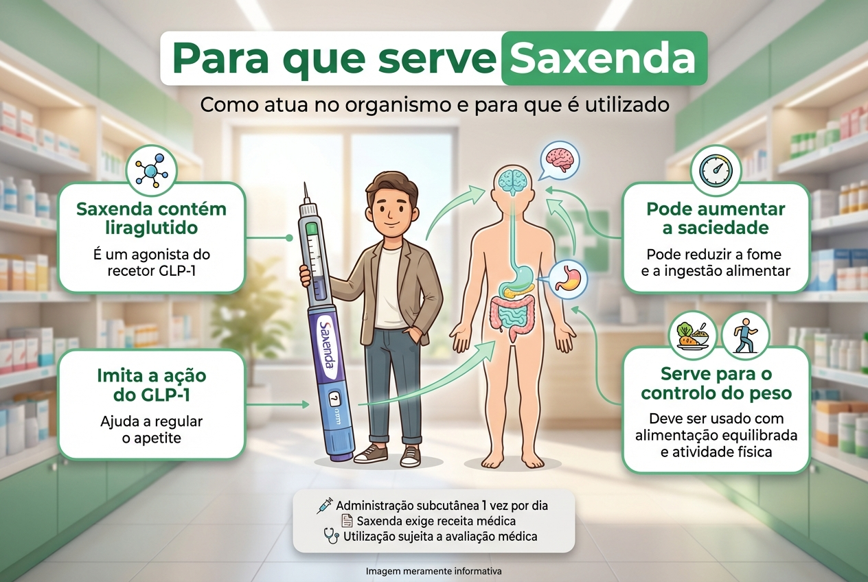 Nota: Este artigo é informativo e não substitui aconselhamento médico. Saxenda é um medicamento sujeito a receita médica. Nunca inicie, altere ou interrompa o tratamento sem orientação de um profissional de saúde.