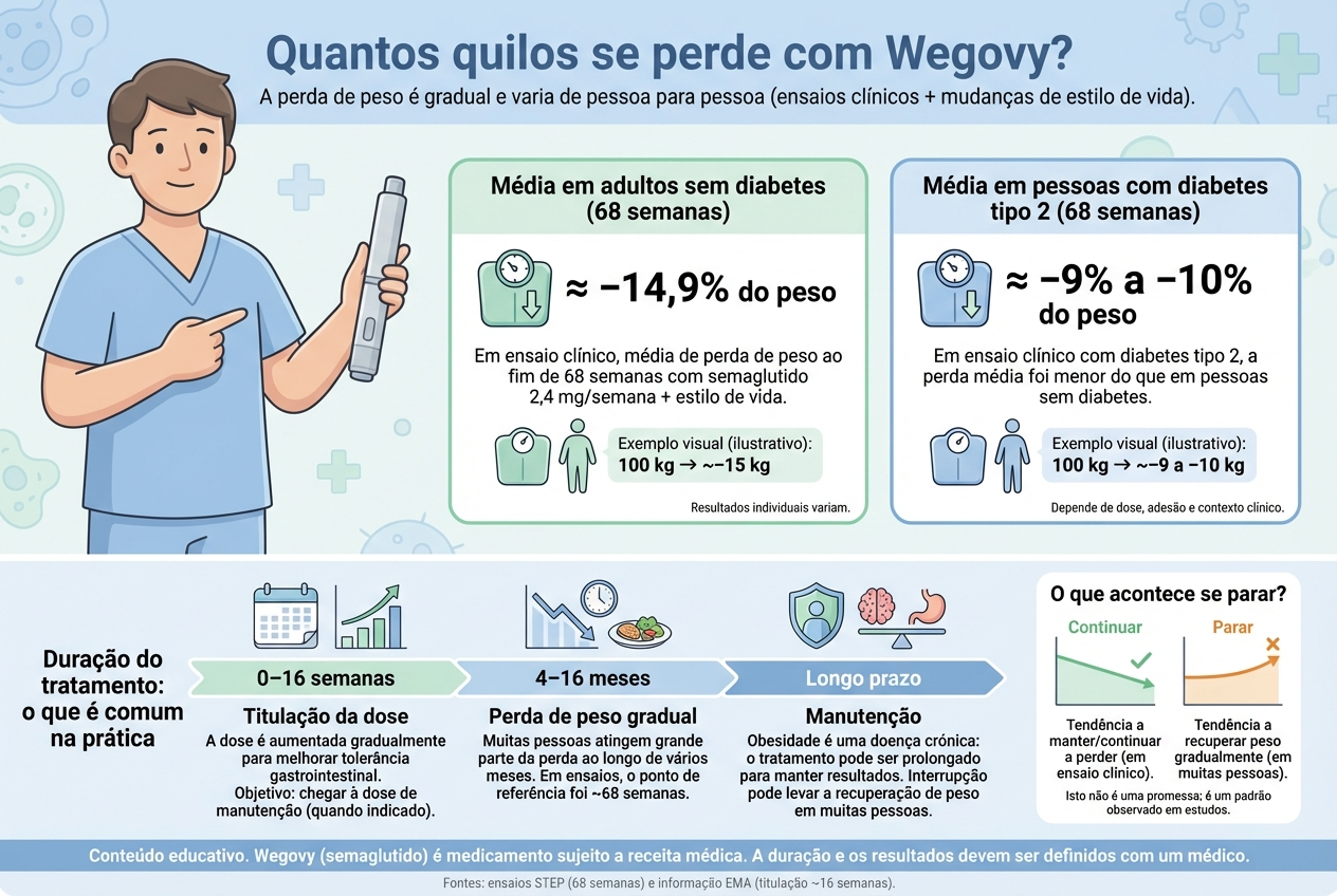 Nota sobre diabetes tipo 2: o Wegovy não está posicionado como fármaco para o tratamento da diabetes tipo 2, essa indicação pertence ao Ozempic (semaglutida em doses menores). No entanto, doentes com diabetes tipo 2 e obesidade podem beneficiar do Wegovy sob supervisão médica, desde que cumpram os critérios de elegibilidade. Qualquer utilização deve ser avaliada e prescrita por um profissional de saúde.