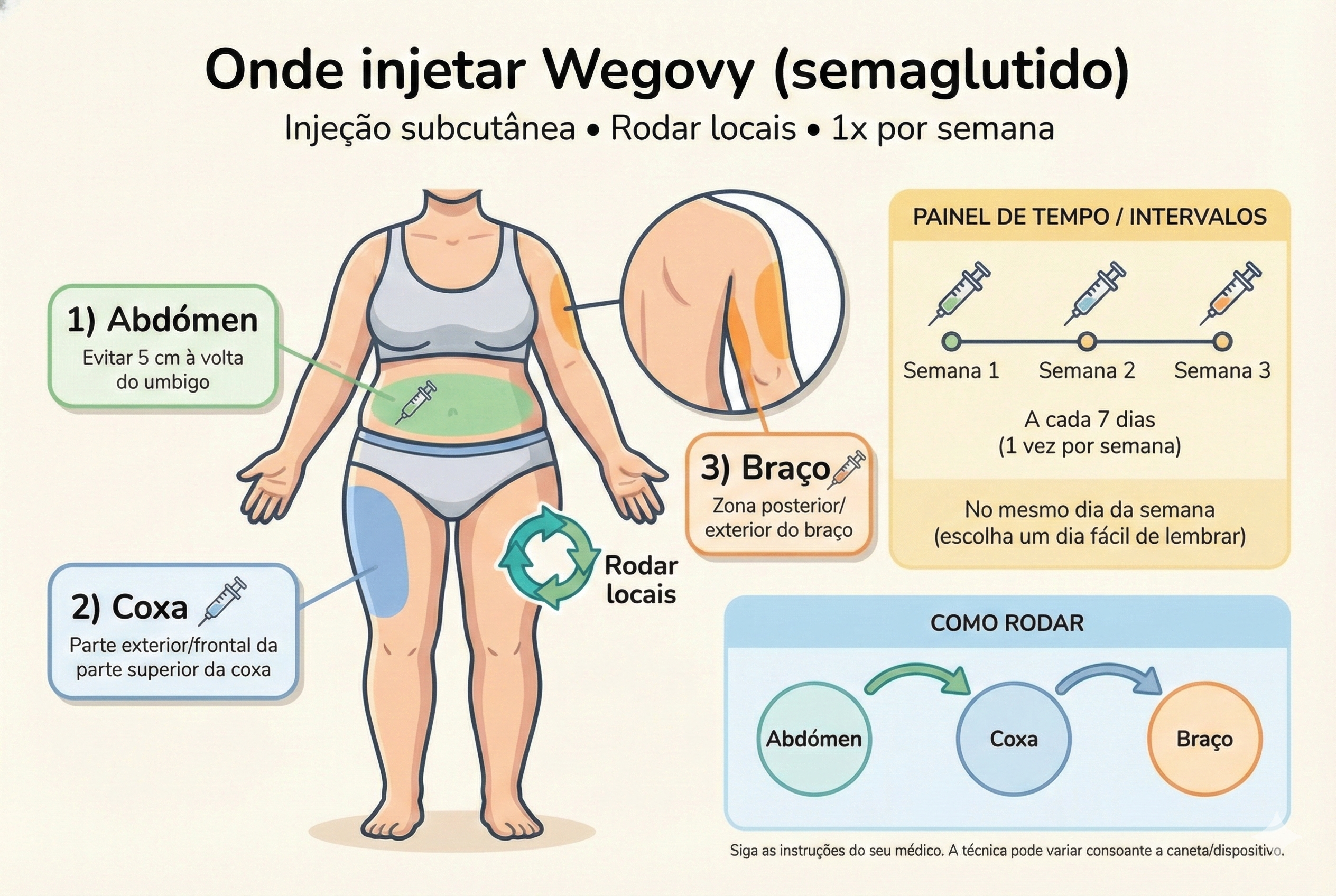 Wegovy: como tomar e onde injetar? Uma injeção subcutânea por semana, sempre no mesmo dia. Pode ser aplicada no abdómen, coxa ou parte superior do braço. Deve alternar os locais de injeção.
