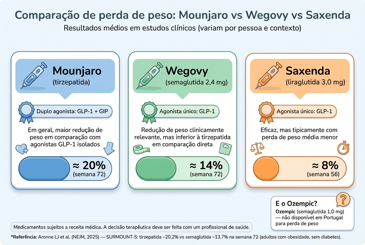 O medicamento mais relevante é o Mounjaro mas existem outros medicamentos GLP-1, como o Wegovy (toma semanal) e o Saxenda (toma diária), que também são frequentemente receitados para perda de peso.